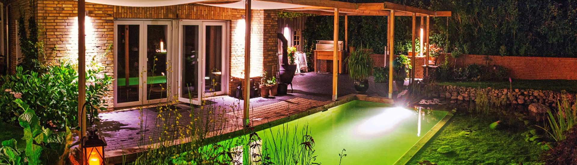 Zwei Jahre später überraschte uns unser Kunde erneut mit faszinierenden Fotos, die zeigen, wie der Schwimmteich und der Garten sich weiterentwickelt hatten. Eine Terrassenüberdachung, stimmungsvolle Gartenbeleuchtung, ein gemütlicher Lagerfeuerplatz und ein beeindruckender Rost-Wasserfall sind nur einige der Highlights. Zahlreiche weitere Design-Objekte bereichern den Garten.