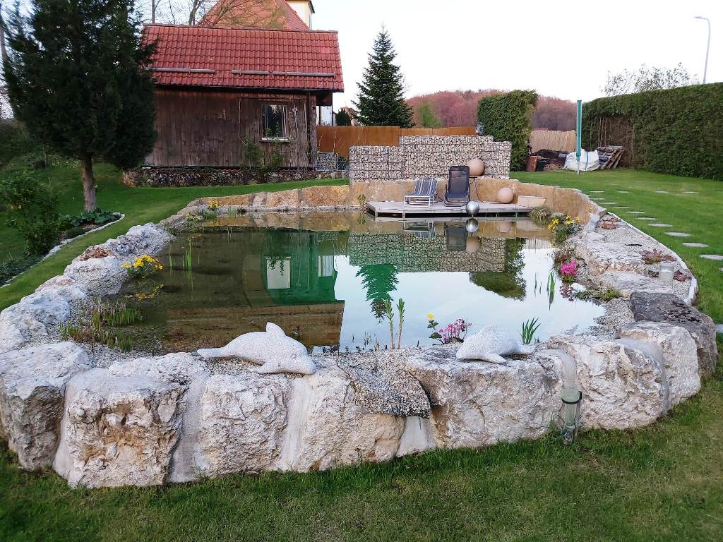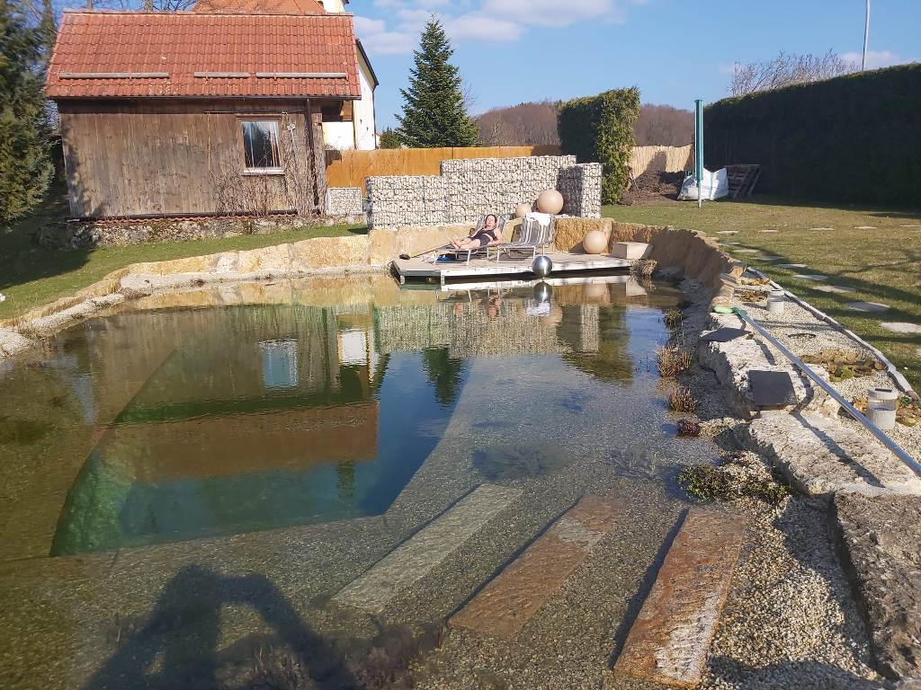 Im Sommer 2019 machte sich ein Kunde in der fränkischen Schweiz an den Selbstbau eines Schwimmteichs. Das Ziel war klar: Ein Teich, der das ganze Jahr über genutzt werden kann. Der Teich wurde auf die natürliche Hanglage des Gartens abgestimmt und sollte sich harmonisch in das Gesamtbild einfügen. Ein besonderes Augenmerk lag auf der massiven Steinumrandung, Trittsteinen durch den Pflanzbereich und einer schwebenden Terrasse.
