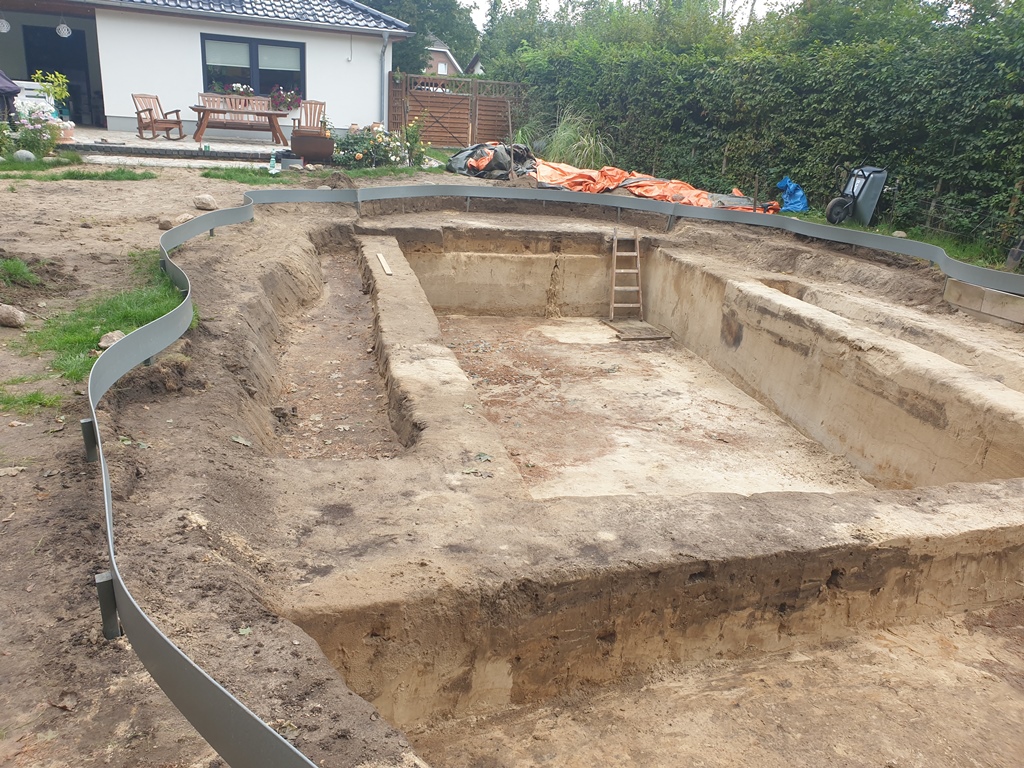 Die Außenkanten wurden abgestochen, und der Erdaushub erfolgte mit einem Bagger. Dank des festen Bodens waren keine Mauern erforderlich, selbst das ehemalige Loch des Aufstellpools konnte aufgefüllt und stabilisiert werden. Zur zusätzlichen Stabilisierung diente ein Teichband entlang der Außenkante.