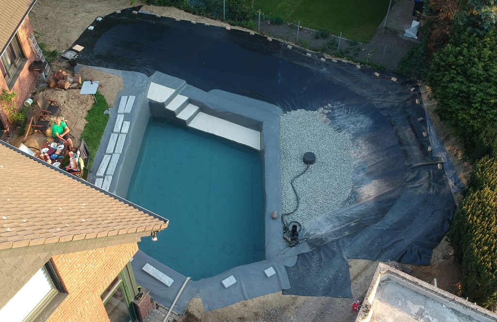 Mittwoch, den 09.05.2018: Auf einmal geht es ganz schnell: Die Schwimmteichfolie kommt. Wir haben uns für einen Folienmix entschieden: Im Schwimmbereich graue Folie, die wirkt neutral und ist sehr unempfindlich gegen Ablagerungen. Auf den Treppen eine Sandfarbene Anti-Rutsch Folie – damit der Einstieg sicher ist.